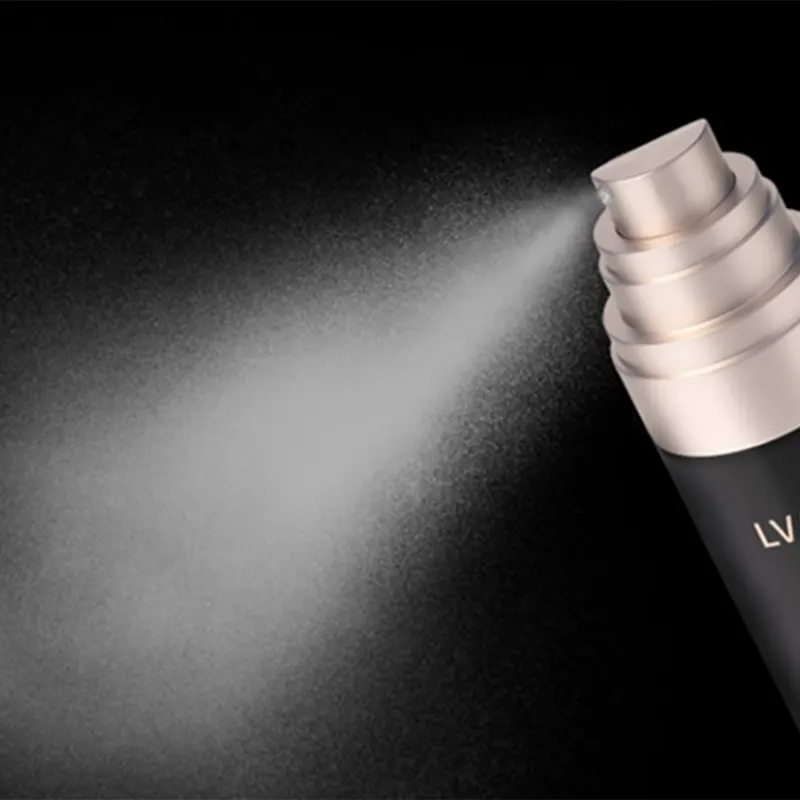 Całkowicie zamknij oczy i usta, a następnie mocno naciśnij pompę, aby równomiernie zmcła twarz, trzymając butelkę od 6 do 10 cali od skóry.